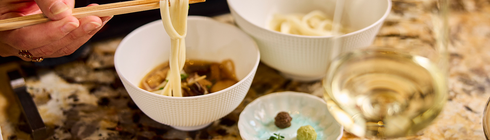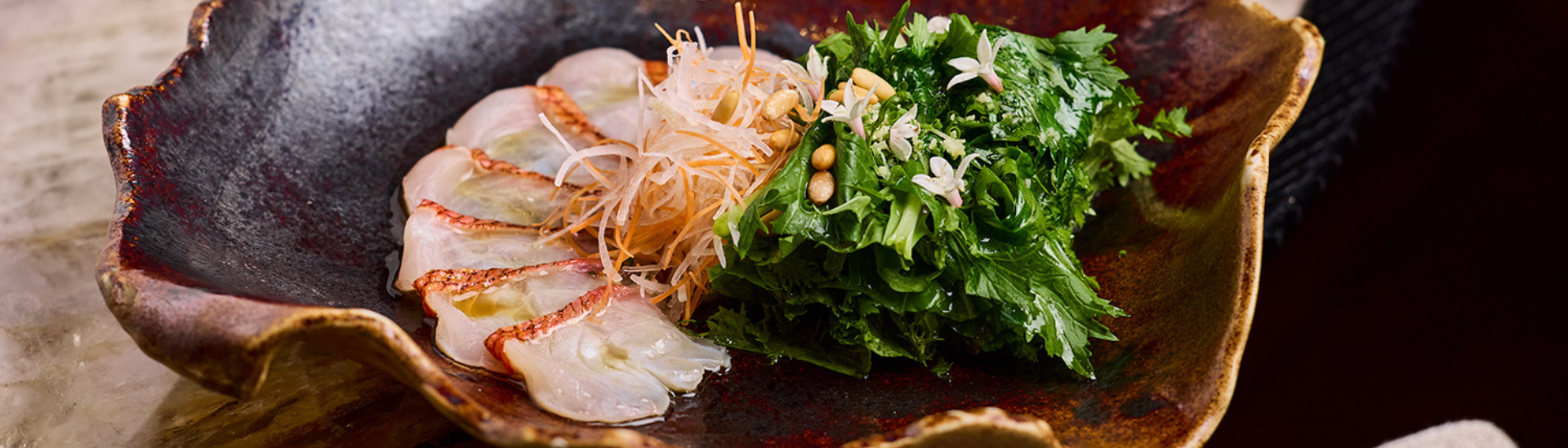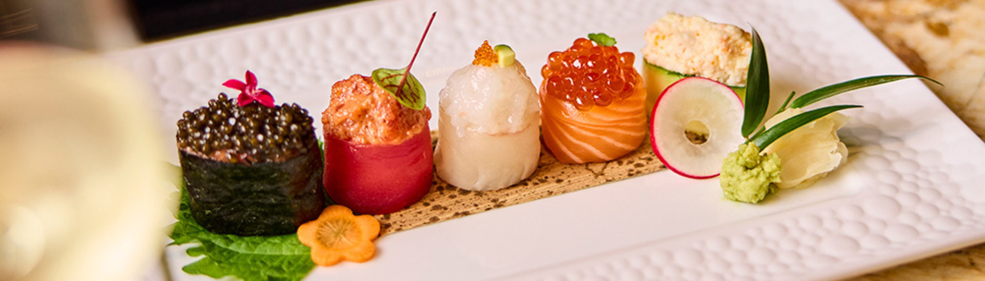 - Tagliatelle di frumento in brodo dashi e ko cream, uova di salmone, ikura, pepe sansho e wasabi